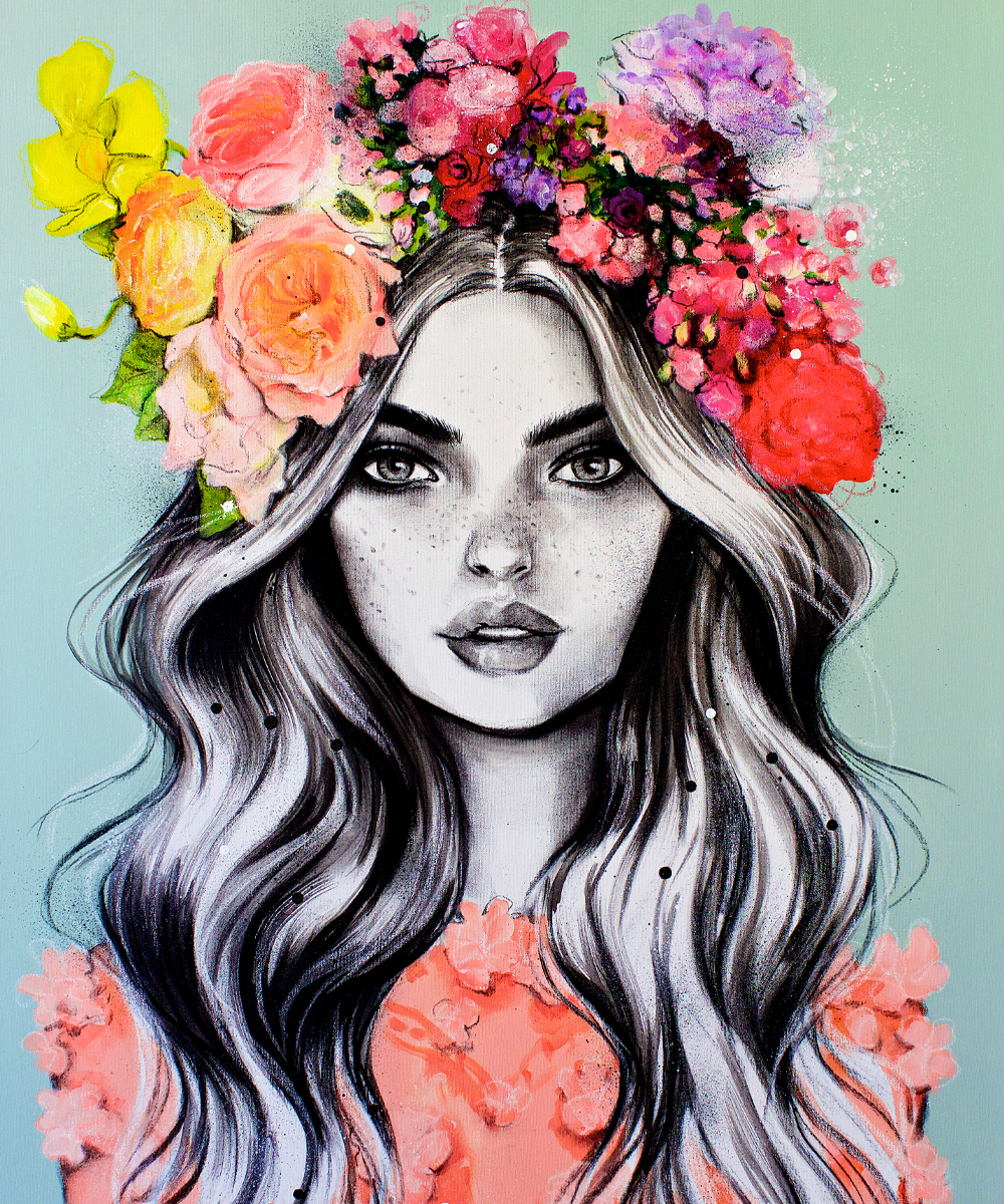 Acrylic, charcoal, paint pens, soft pastel and spray paint on canvas