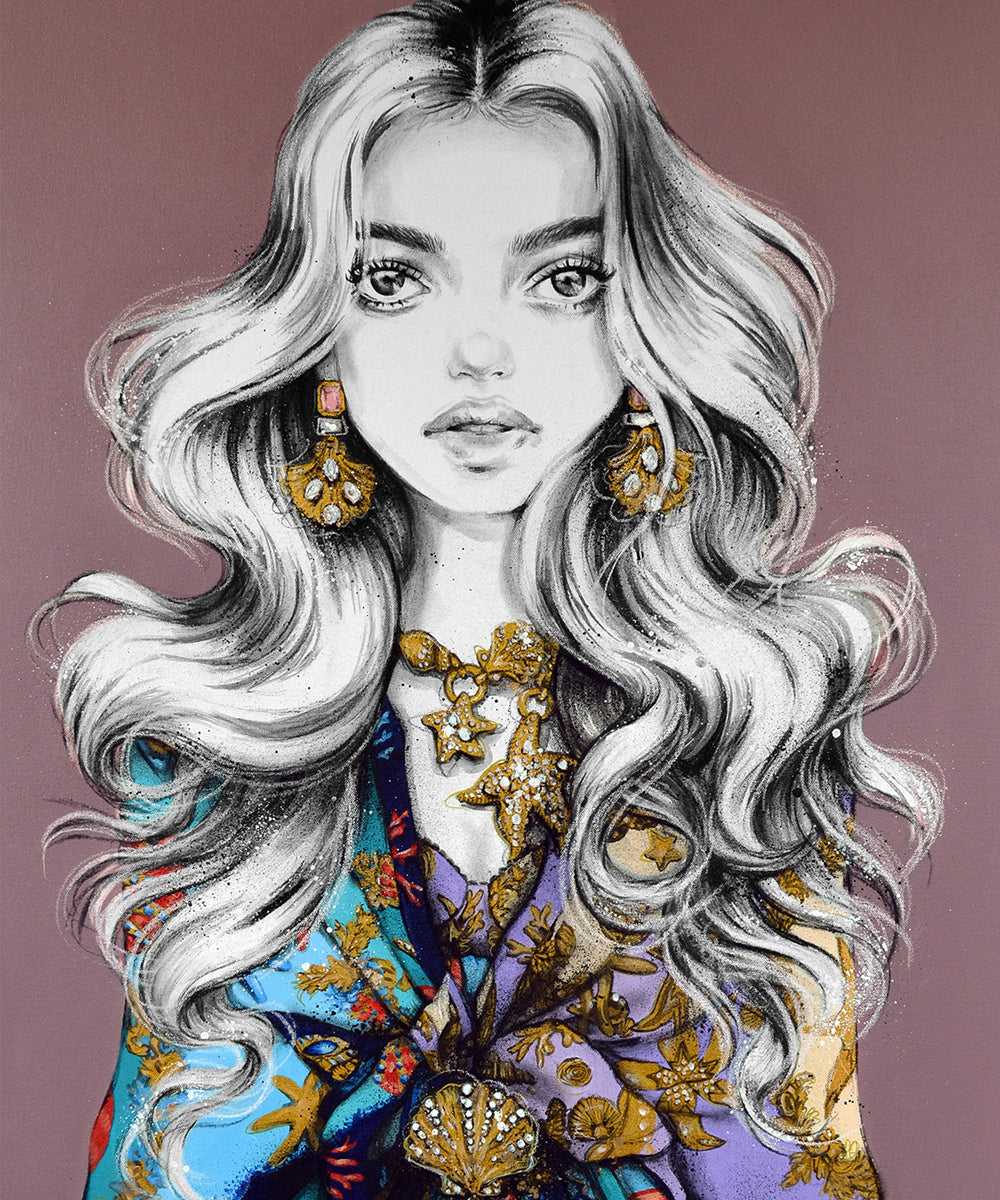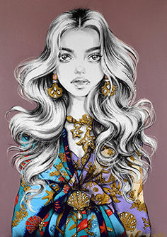 As a tribute to the brand’s late founder Gianni Versace, his sister Donatella’s SS18 collection for Versace was a reworking of historic prints, archival looks and the glamorous vibe Versace is famous for. It’s French connection is it’s reinterpretation of French Renaissance art. It’s definitely one of my favourite shows from the past few years and I knew I either had to own a piece or at least draw something from it. Two beautiful girls with underwater-like mermaid hair wear two of the iconic runway looks. Gold and diamond encrusted jewellery and accessories swing from gold chains featuring étoile de mer (starfish), scallop and conch shells.
